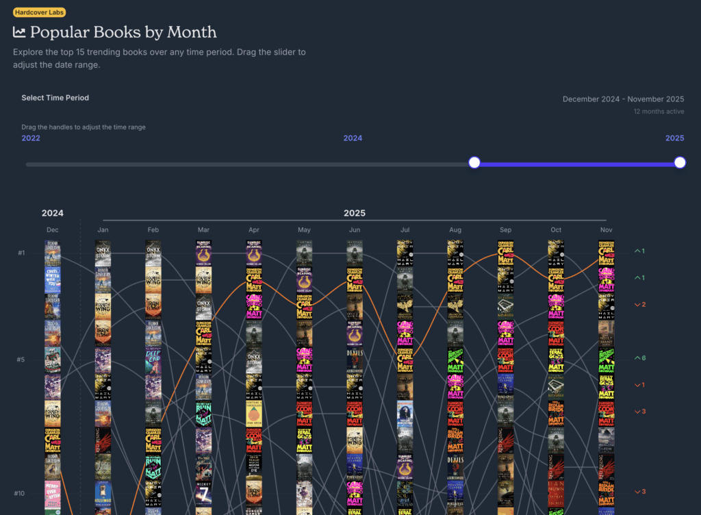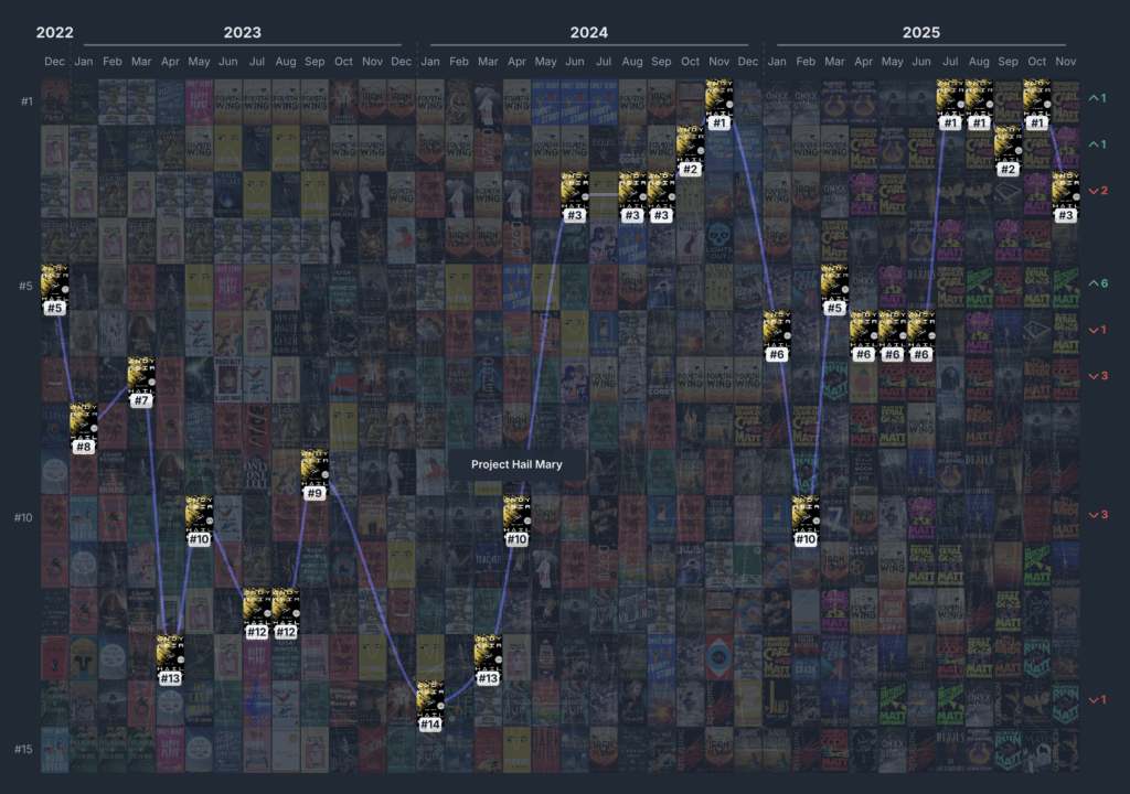Like 2024, we won’t be using AI for this. Unlike 2024, we’re going to wait until the year is over to create this. 😅 In past years we’ve tried to launch this on January first (or Christmas one year for some resaon). But that also means re-running queries up until release. Sometimes that meant changing graphics when the most popular books changed. In 2023, Fourth Wing and Tress of the Emerald Sea swapped the #1 position the day before we launched!