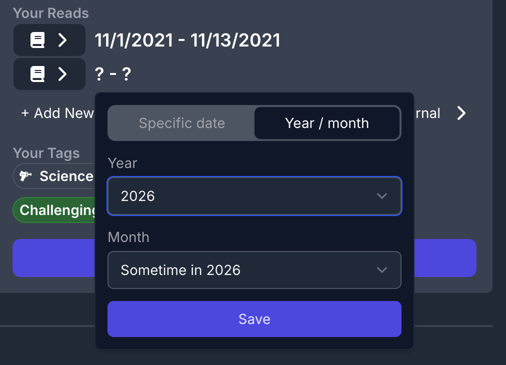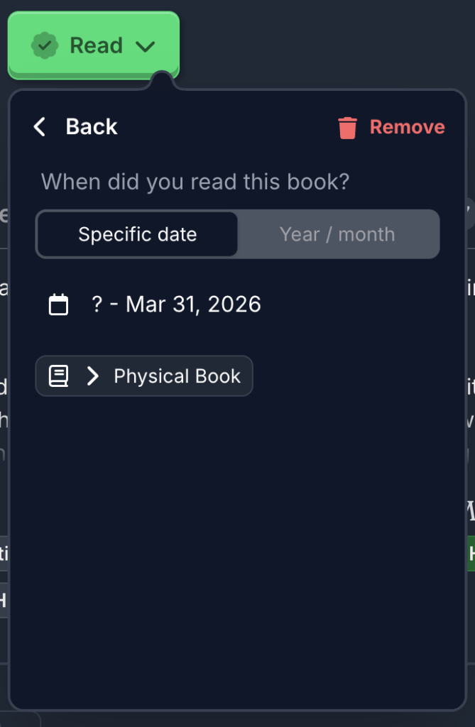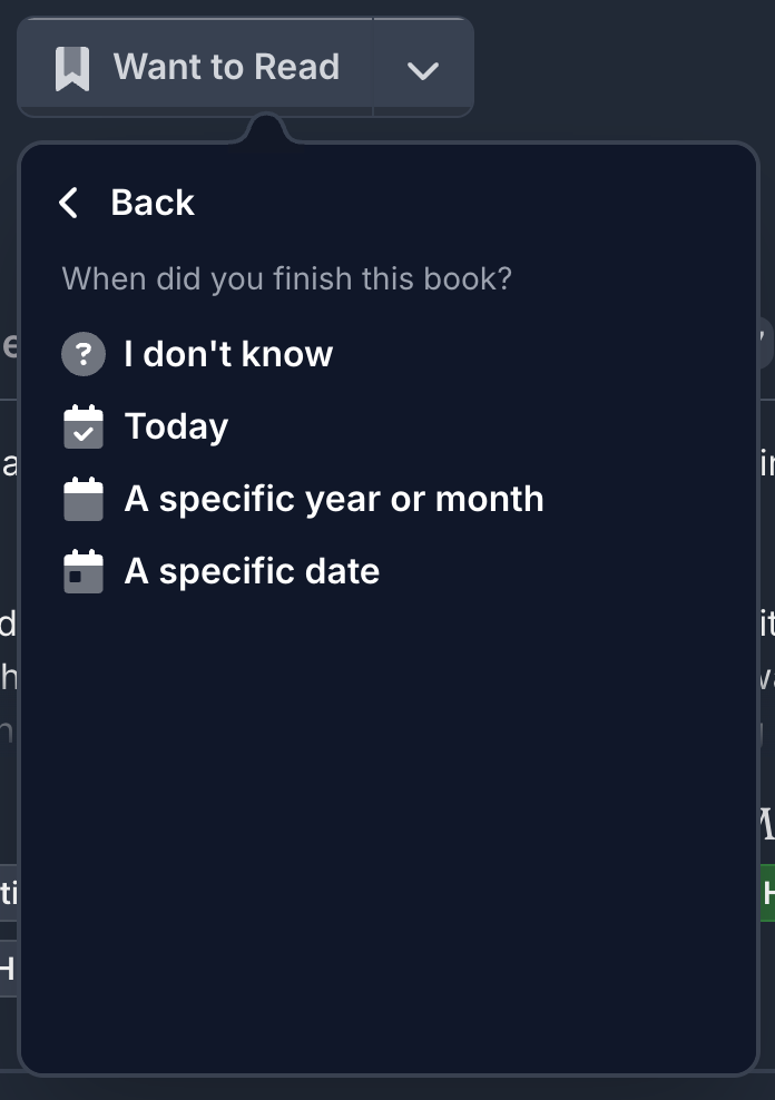 In the book button, when you mark a book as “Read”, you’ll now see a new dialog to set when you read it with four options: