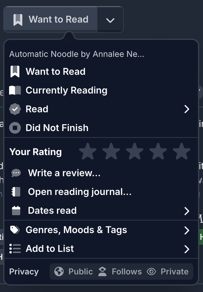 Side note: These options won’t show up if your book is in “Currently Reading”. In that case, marking as Read will always set the finished at date to the time you mark it as Read.